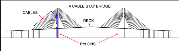 The cables can be attached to the roadway in either of two main ways. In a radial pattern, cables extend from several points on the road to a single point at the top of the tower. In a parallel pattern, cables are attached at different heights along the tower, running parallel to one another.